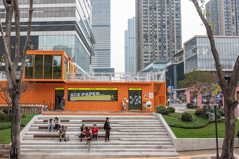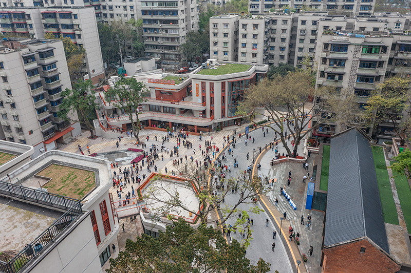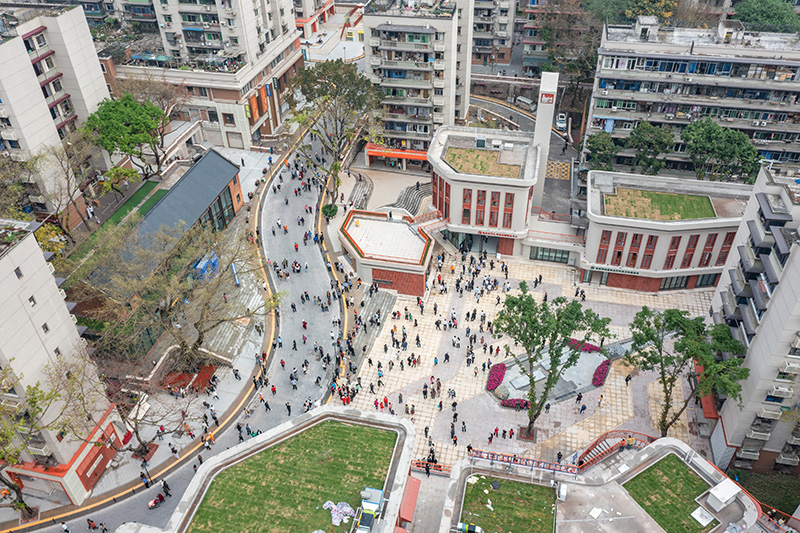 4月28日,在竣工亮相的重庆市九龙坡区谢家湾街道民主村片区城市更新项目(一期),人们在一处公共空间休息(无人机照片)。