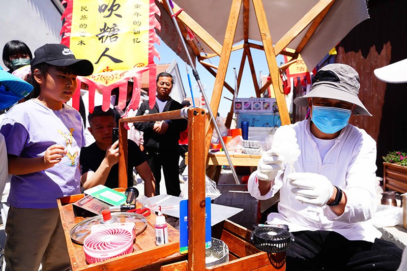 4月30日,在山东省利津县“老街长巷”非遗文化街,游客观看吹糖人制作。