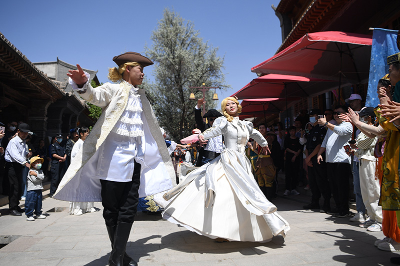 4月30日,演员在甘肃省兰州市西固区河口古镇盛装巡游活动上与游客互动。
