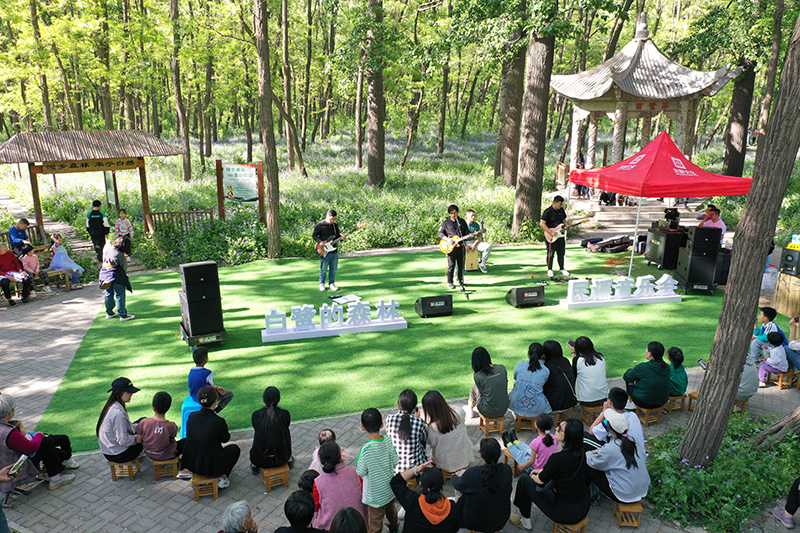 4月30日,游客在山东省滨州市惠民县石庙镇沙窝林场千亩槐树林欣赏民谣音乐会。