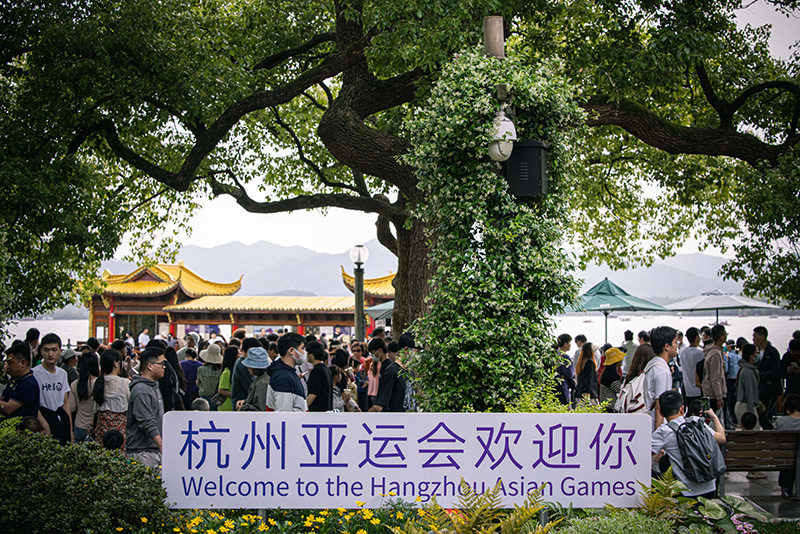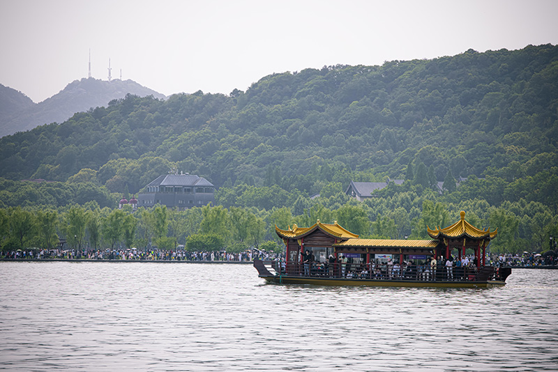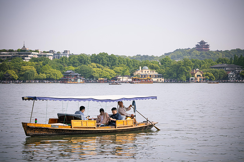 4月30日,满载游客的游船行驶在杭州西湖水面上。