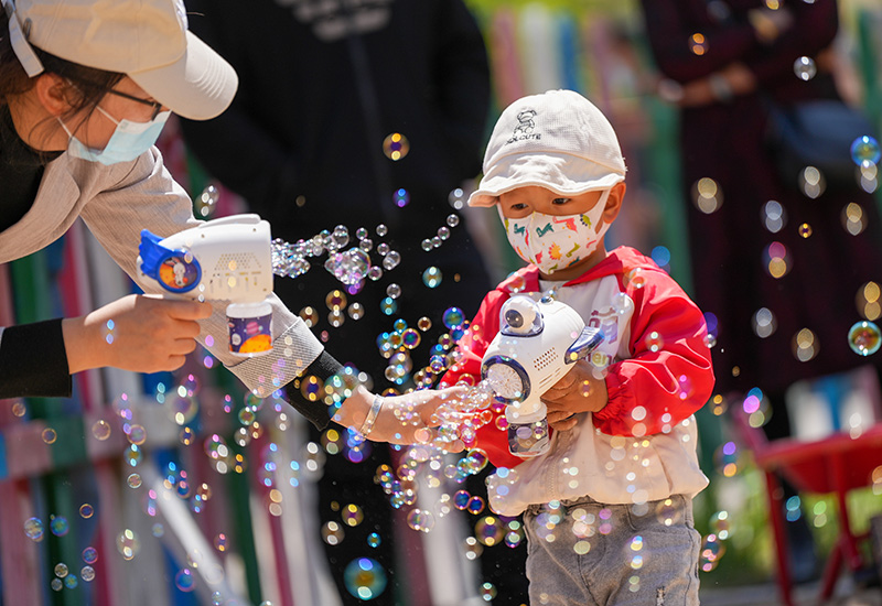 4月30日,家长带着小朋友在河北省遵化市一景区玩耍。
