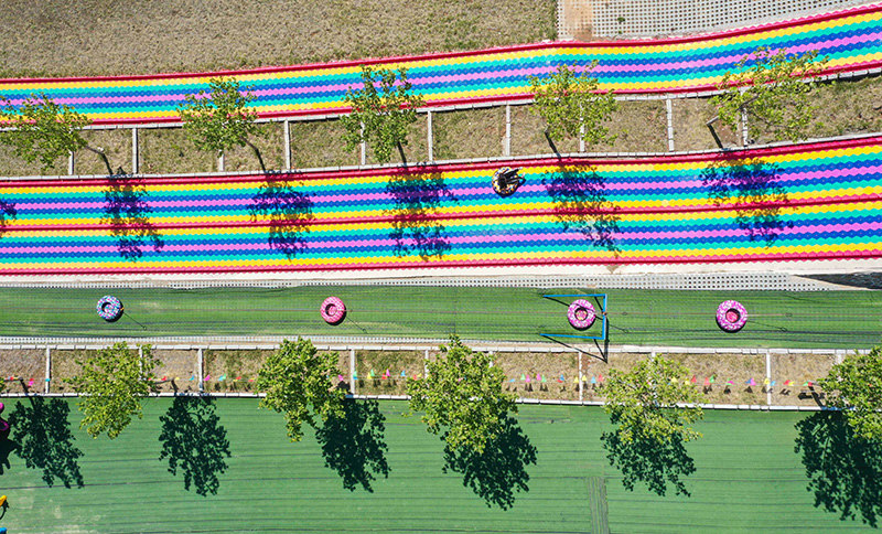 4月30日,游客在河北省遵化市一景区体验七彩滑道游乐项目(无人机照片)。