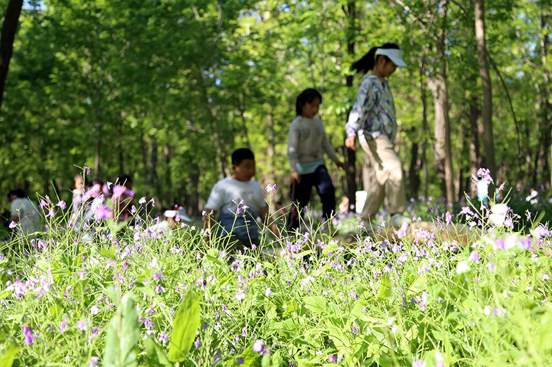 4月30日,小朋友在山东省滨州市惠民县石庙镇沙窝林场千亩槐树林玩耍。