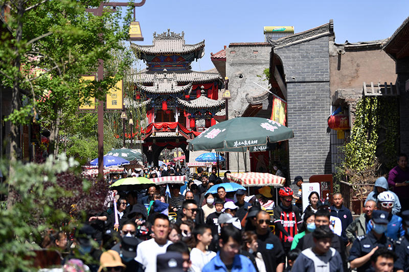 4月30日,游客在甘肃省兰州市西固区河口古镇游览。