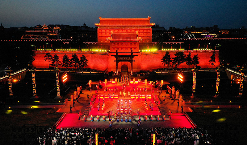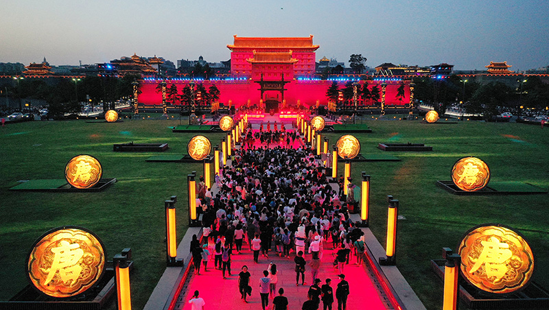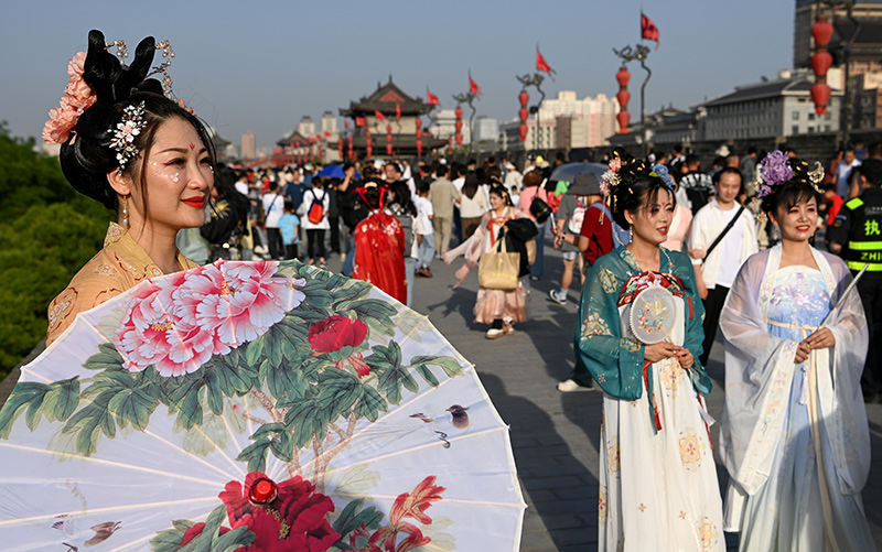 4月30日,游客在西安城墙景区观看《梦长安——大唐迎宾盛礼》。