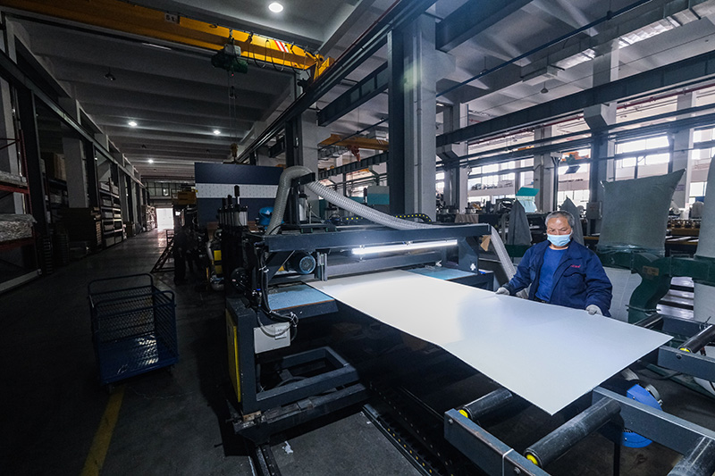5月2日,在位于浙江省嘉兴市秀洲区王店镇的浙江鼎美智装有限公司生产车间内,一张张无胶大板正通过流水线。