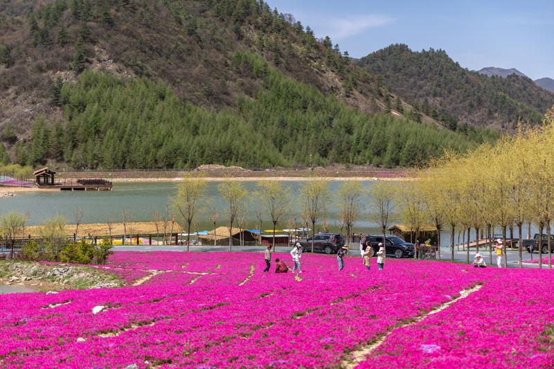 5月1日,在红池坝国家森林公园,游客在花海中打卡拍照。