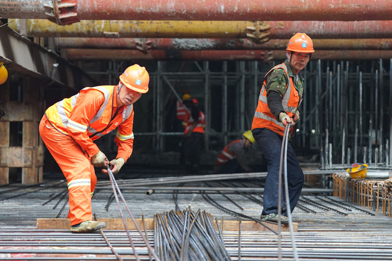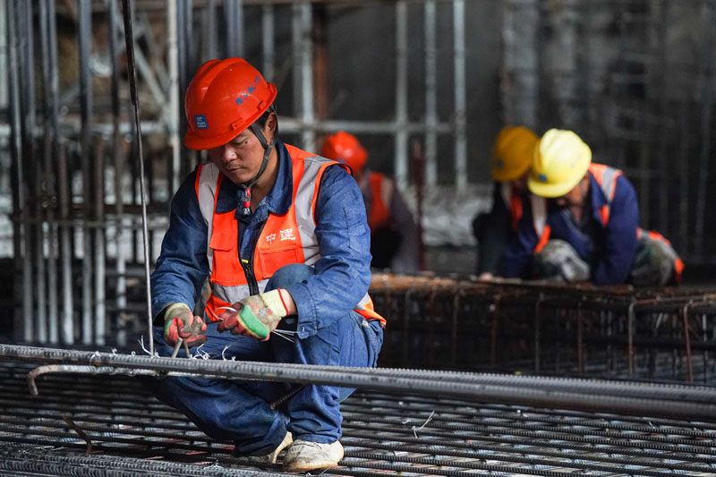 5月3日,中建八局的工人在合肥地铁7号线莲花路站工程现场施工。