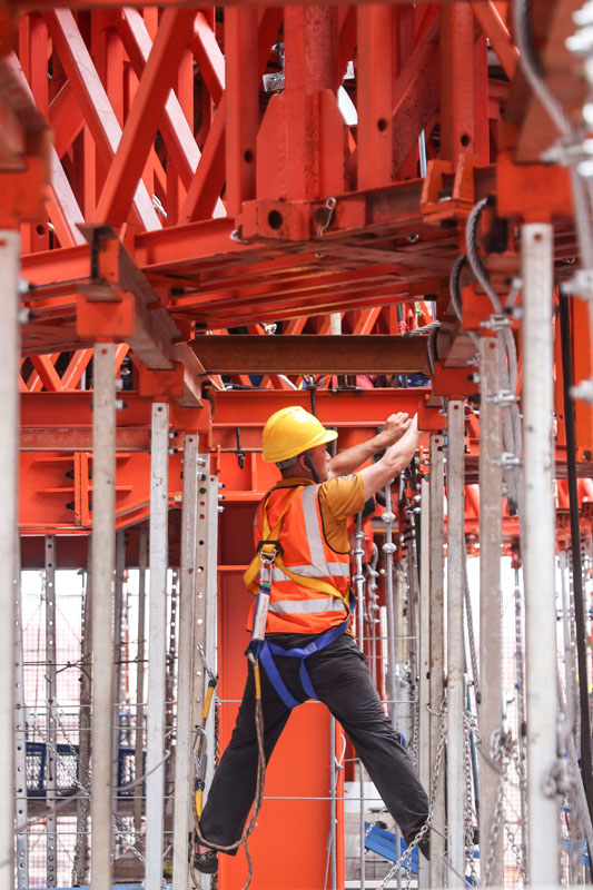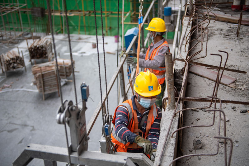 5月3日,中建三局的工人在海南中心项目的“空中造楼机”内施工。