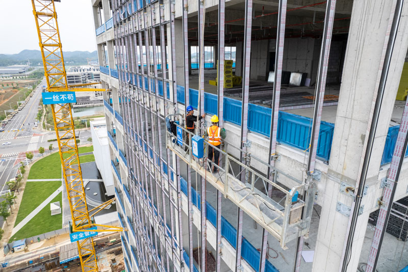 5月3日,工人在湖南长沙智谷项目建设工地为一栋高层建筑安装幕墙。