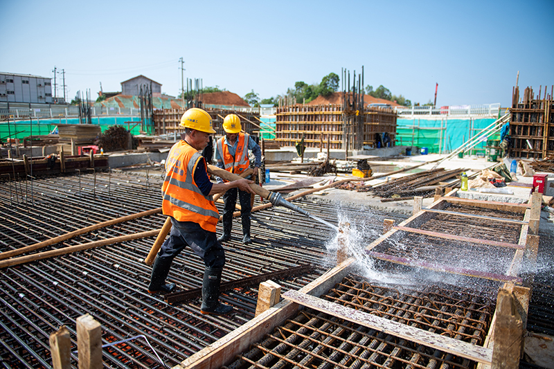 5月3日,在长沙西站建设工地,工人进行混凝土浇筑作业。