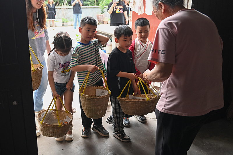 5月4日,小朋友手提竹篮,体验挨家挨户“派野米”的习俗,再用收集到的食材蒸“野米饭”。