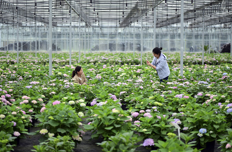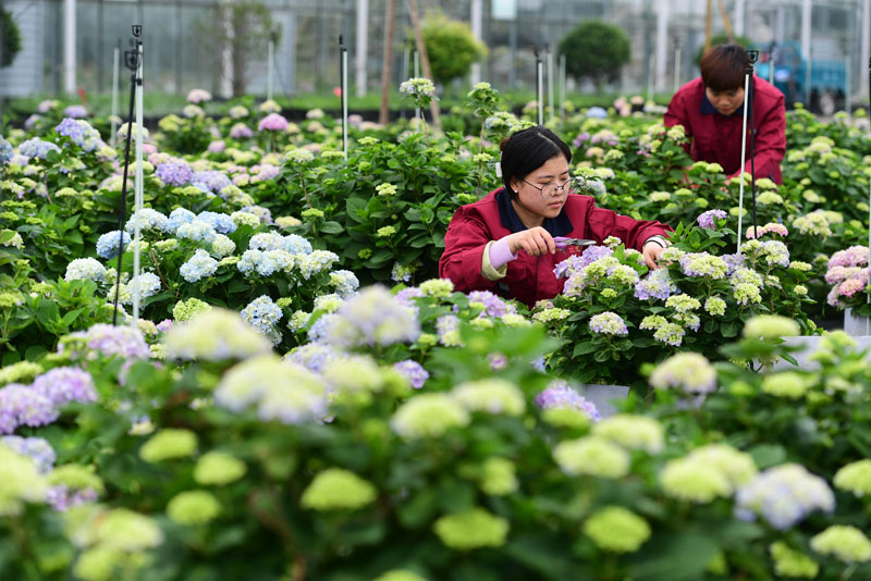 5月5日,在肥西县经开区一家农林科技企业,员工在花卉种植基地打理绣球花。