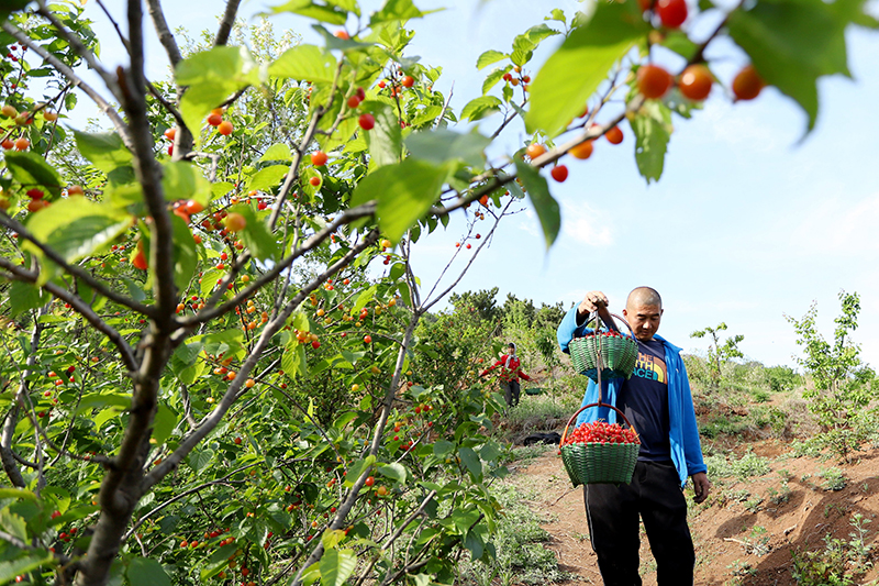 5月6日,山东省青岛市西海岸新区铁山街道杨家山里片区的农民搬运采摘的樱桃。