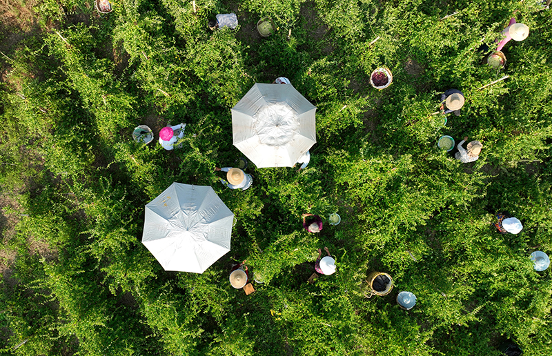 5月5日,村民在四川省广安市武胜县清平镇华家坪村金银花种植基地采摘金银花(无人机照片)。