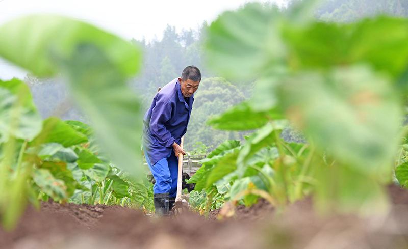 5月6日,农民在浙江省台州市仙居县白塔镇和塘村田园里给种植的芋头培土、除草。