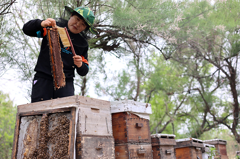 5月5日,山东省滨州市无棣县的蜂农在采收蜂蜜。