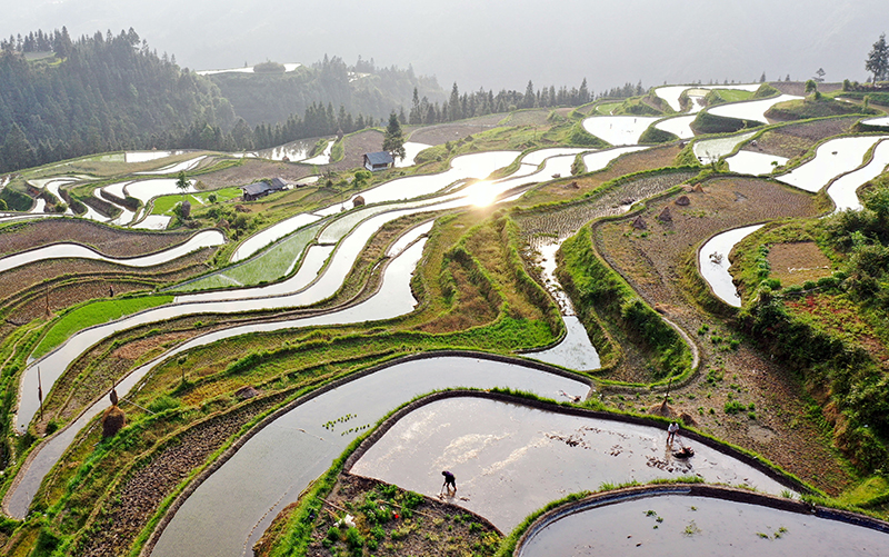 5月6日,村民在贵州省黔东南苗族侗族自治州从江县加榜乡加页村的梯田里劳作(无人机照片)。