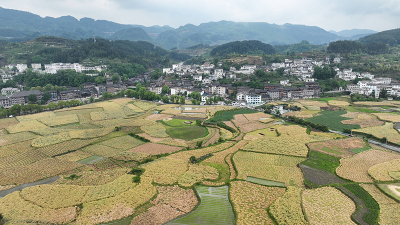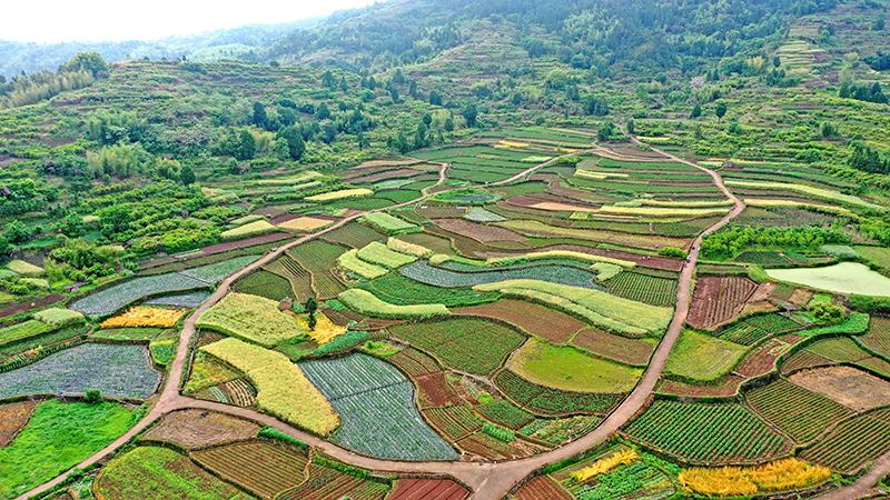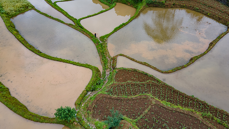 5月6日,在重庆市秀山土家族苗族自治县洪安镇美其村,村民在田间行走(无人机照片)。