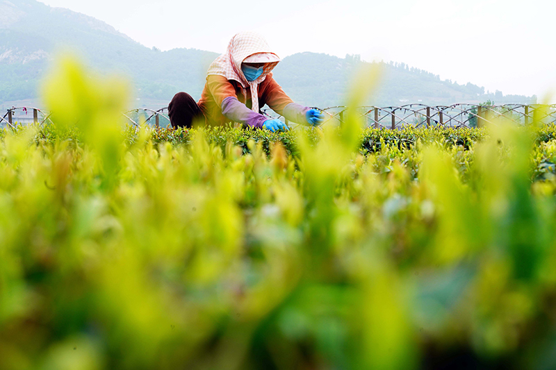 5月6日,在日照市岚山区巨峰镇,茶农在采茶。