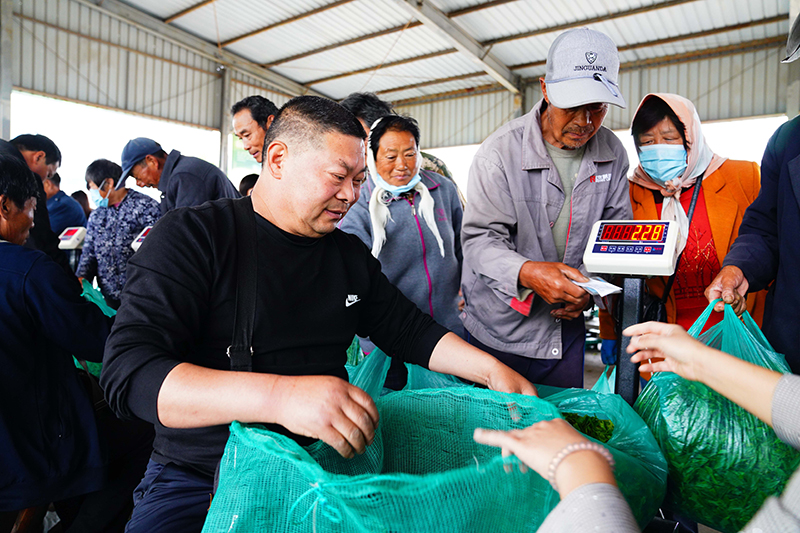 5月6日,在日照市岚山区巨峰镇薄家口茶叶交易市场,茶农在卖鲜叶。