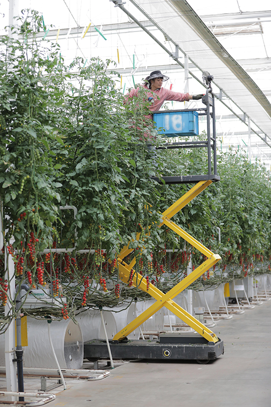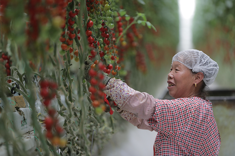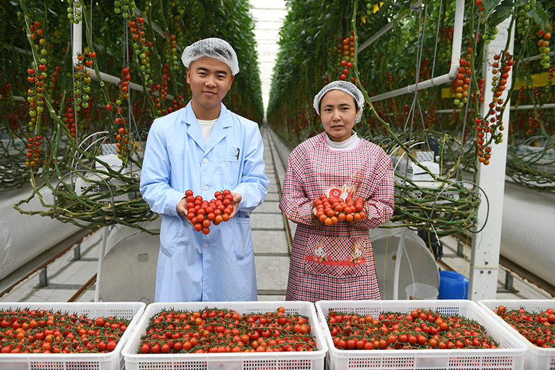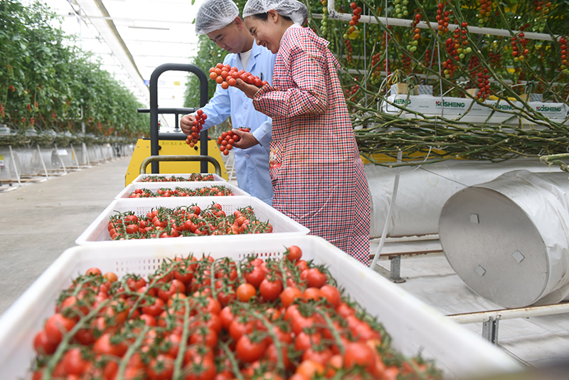 当日,在甘肃省武威市古浪县黄花滩移民区,古浪越海智能工业化栽培生态项目的职工忙着采收番茄、打包装箱、发送订单。据了解,这个智能温室工业化栽培生态项目应用了温室环境智能中控技术、智能水肥循环技术等,打造出技术先进、节能环保的现代化智能玻璃温室,出产的串收番茄口感好、销路旺,带动黄花滩移民区大量农户就业,受雇农民平均月收入超4000元。
