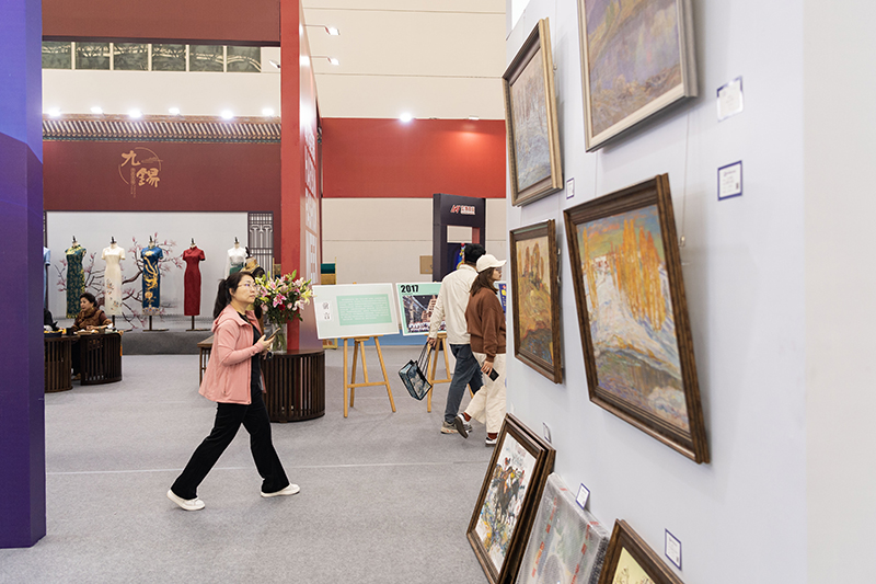 5月7日,在哈尔滨国际会展体育中心,观众在首届东北亚文化艺术创意设计博览会上留影。