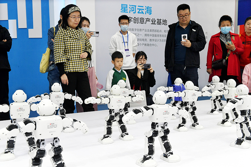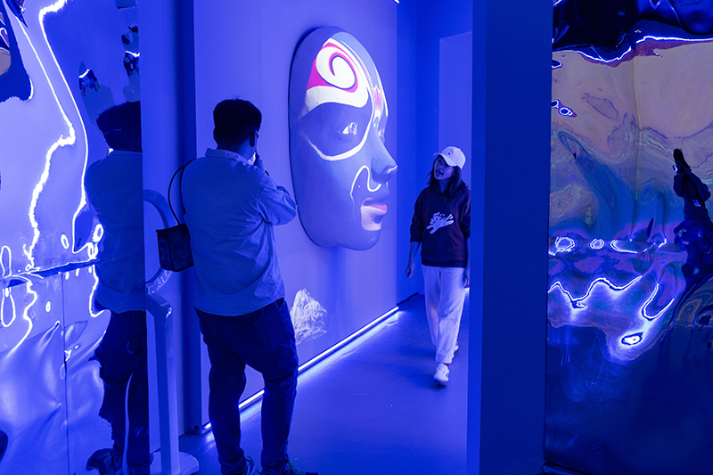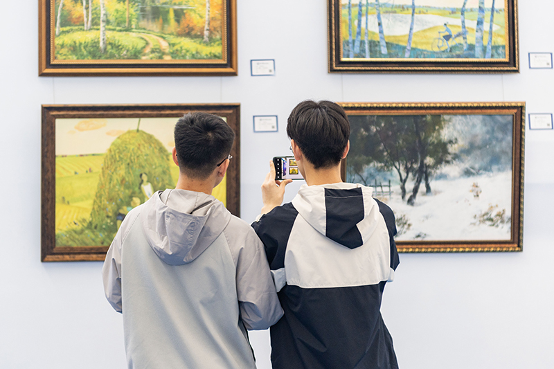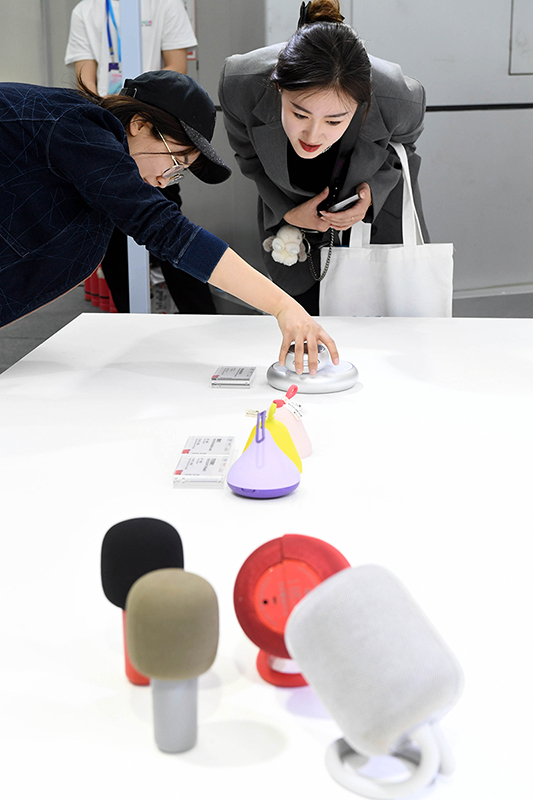 5月7日,在哈尔滨国际会展体育中心,观众在首届东北亚文化艺术创意设计博览会上参观拍照。