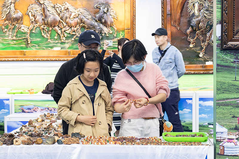 5月7日,在哈尔滨国际会展体育中心,观众在首届东北亚文化艺术创意设计博览会上参观选购。
