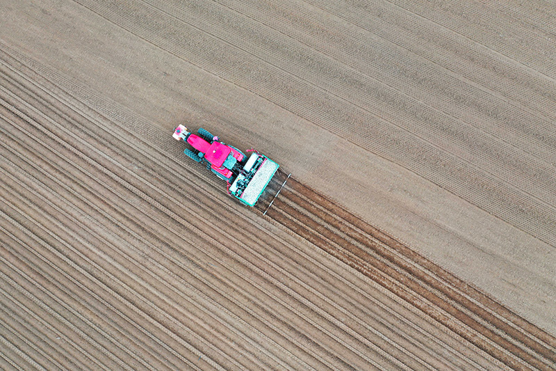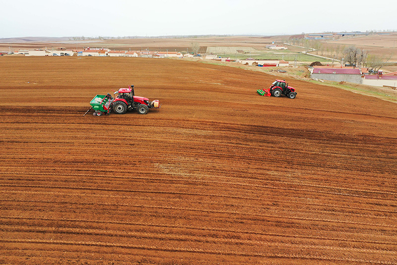 在武川县霍家沟村,农民操作播种机械进行马铃薯播种作业(5月9日摄,无人机照片)。