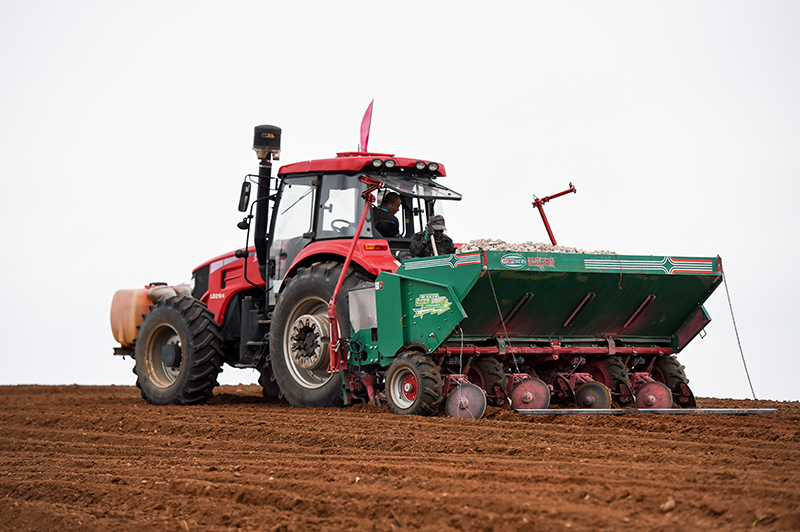 在武川县霍家沟村,农民操作播种机械进行马铃薯播种作业(5月9日摄)。