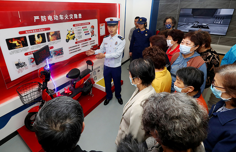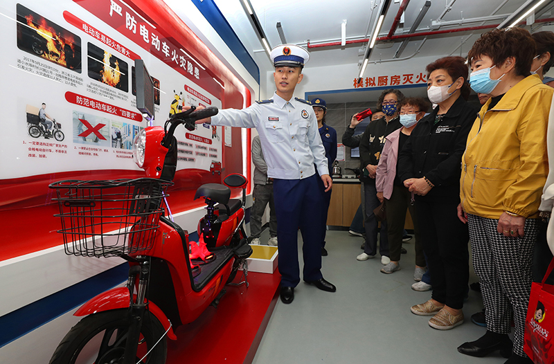5月11日,长宁区消防救援支队的消防员向社区居民讲解电动车充电存在的火灾风险。