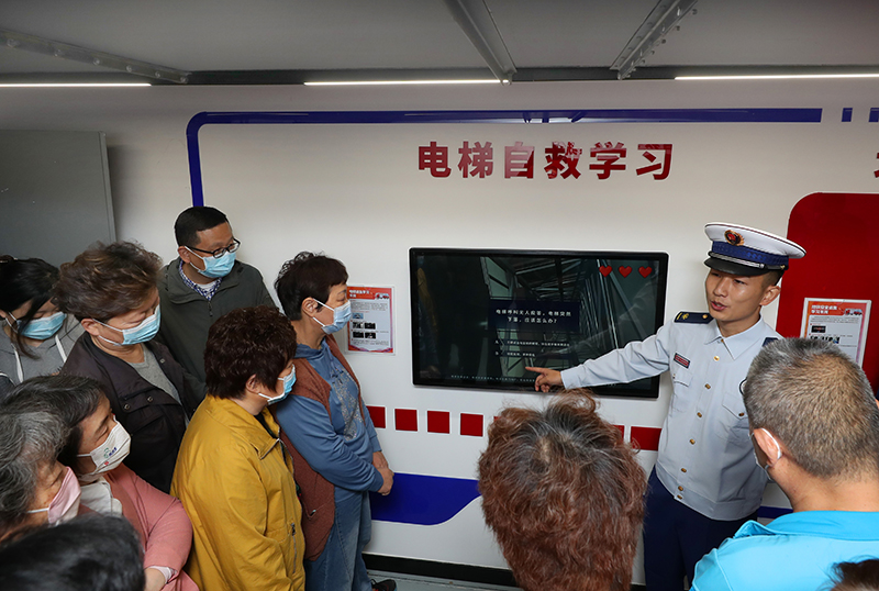 5月11日,长宁区消防救援支队的消防员向社区居民讲解电梯故障中逃生自救方法。