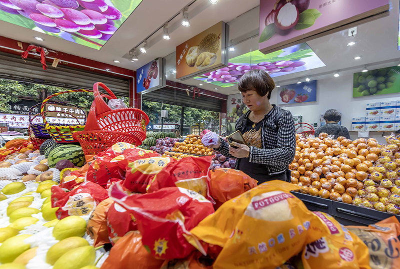 5月11日,消费者在贵州省黔西市一家超市选购水果。