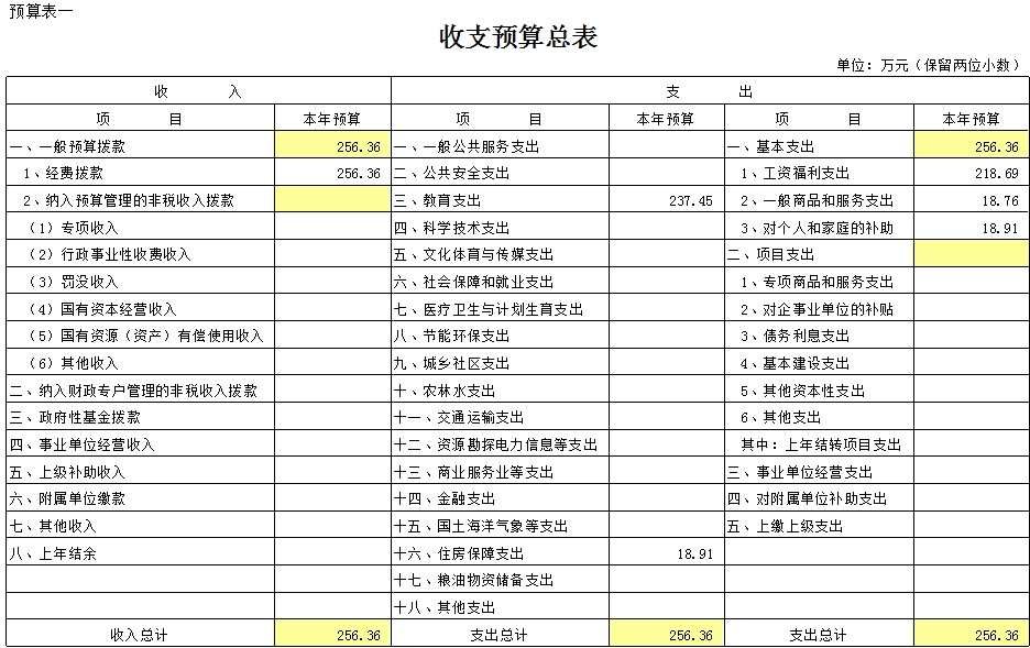 预算总支出256.36万元,其中:基本支出256.36万元(工资福利支出218.69万元、一般商品和服务支出18.76万元、对个人和家庭的补助支出18.91万元)。