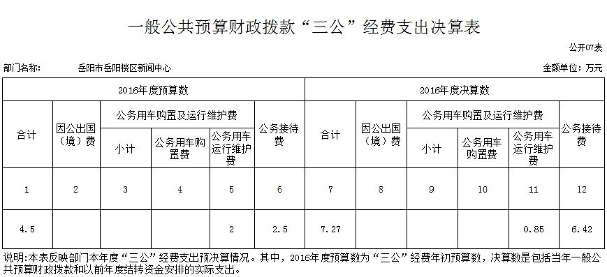 2016 年度“三公”经费财政拨款支出预算为4.5万元,支出决算为7.27万元,完成预算的161.56%,其中:公务用车运行维护费支出决算为0.85万元,完成预算的18.89%;公务接待费支出决算为6.42万元,完成预算的142.67%。2