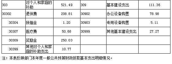 工资福利支出1179.99万元,其中:基本工资358.11万元、津补贴357.53万元、社会保障缴费24.84万元、奖励金120.49万元、其他工资福利支出300.61万元。对个人和家庭的补助521.49万元,其中:退休费208.81万元、抚恤金1.2万元、医疗金50.67万元、奖励金250.02万元、其他对个人和家庭的补助10.77万元。商品和服务支出847.63万元。基中:办公费60.89万元、印刷费23.38万元、水费15.93万元、电费30.73万元、邮电费17.44万元、差旅费157.45万元、维修费67.74万元、被装购置费87.38万元、劳务费4.32万元、工会经费5.2万元、其他商品服务支出336.07万元。基本建设支出111.37万元。其中:办公设备购置78.98万元、专用设备购置5.11万元。公务用车运行维护费29.9万元、公务接待费38.18万元。