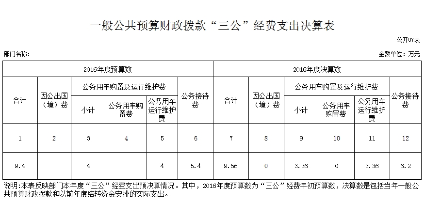 我单位2016年“三公”经费预算安排9.4万元,其中:公务接待费5.4万元。2016年“三公”实际支出为9.5万元,其中:公务接待费6.1万元。