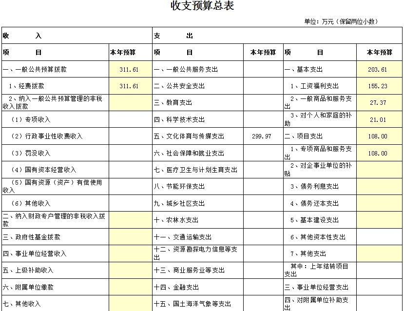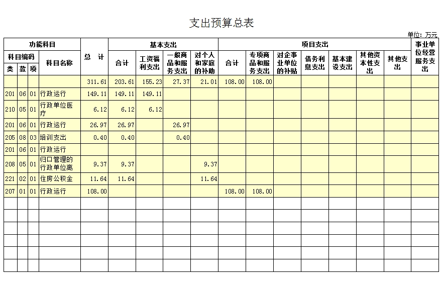预算总支出311.61万元,其中:基本支出203.61万元(工资福利支出155.23万元、一般商品和服务支出27.37万元、对个人和家庭的补助支出21.01万元);项目支出108万元。
