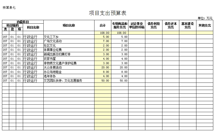 安排预算内专项经费108万元,主要项目:1、文化三下乡5万;2、广场文化活动7万;3、社区文化2万;4、体育事业经费2万;5、新闻出版及扫黄打非3万;6、农家书屋4万;7、非物质文化遗产保护经费3万;8、大众体育活动20万;9、办公场地租金8万;10、老年体协4万;11、文艺团队扶持、文化志愿服务50万。