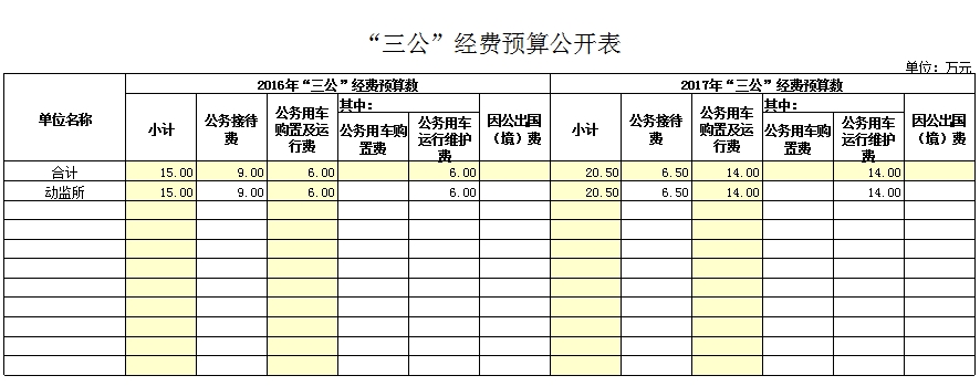 2017年“三公”经费预算数为20.5万元,其中,公务接待费6.5万元,公务用车购置及运行费14万元(公务用车运行费 14万元)。比2016年预算增加5.5万元,上升26.8%。