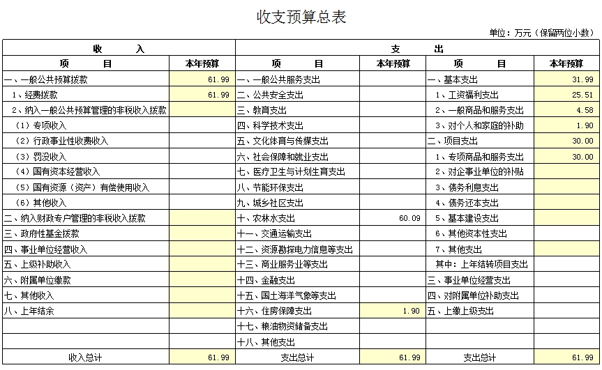 预算总支出61.99万元,其中:基本支出31.99万元(工资福利支出25.51万元、一般商品和服务支出4.58元、对个人和家庭的补助支出1.9元);项目支出30万元。
