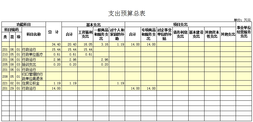 预算总支出34.4万元,其中:基本支出20.4万元(工资福利支出16.05万元、一般商品和服务支出3.16万元、对个人和家庭的补助支出1.19万元);项目支出14万元。