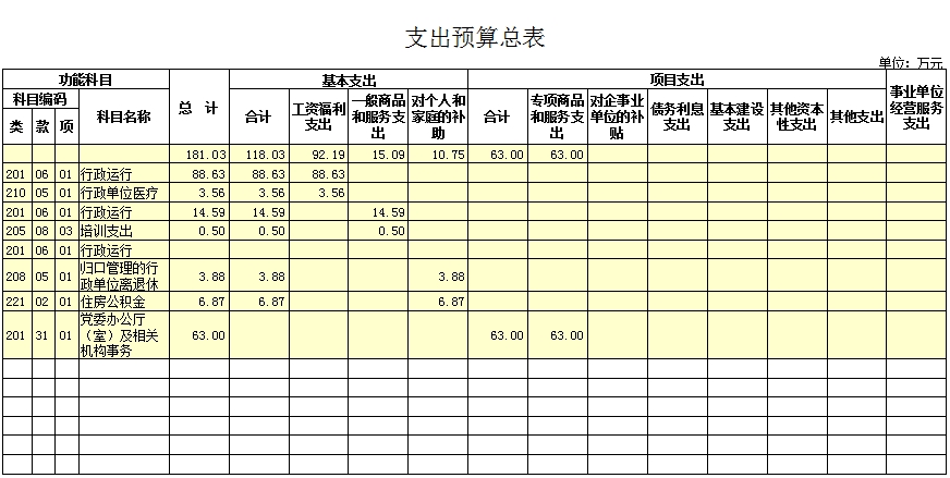预算总支出181.03万元,其中:基本支出118.03万元(工资福利支出92.19万元、一般商品和服务支出15.09万元、对个人和家庭的补助支出10.75万元);项目支出63万元。