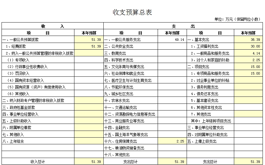 预算总支出51.39万元,其中:基本支出36.39万元(工资福利支出30万元、一般商品和服务支出4.14万元、对个人和家庭的补助支出2.25万元);项目支出15万元。