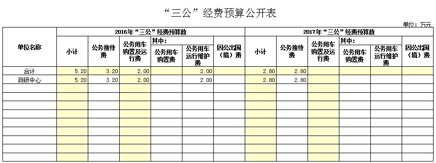 2017年“三公”经费预算数为 2.8万元,其中,公务接待费 2.8 万元。2017年“三公”经费预算较2016年减少2.4万元,主要是取消了2016年度预算中2万元公车运行费用,减少了公务接待费用0.4万元。