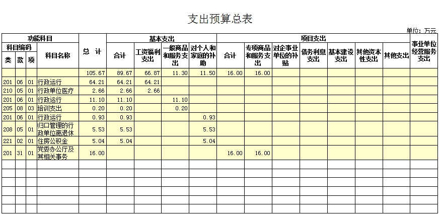 预算总支出105.67万元,其中:基本支出89.67万元(工资福利支出66.87万元、一般商品和服务支出11.3万元、对个人和家庭的补助支出11.5万元);项目支出16万元。