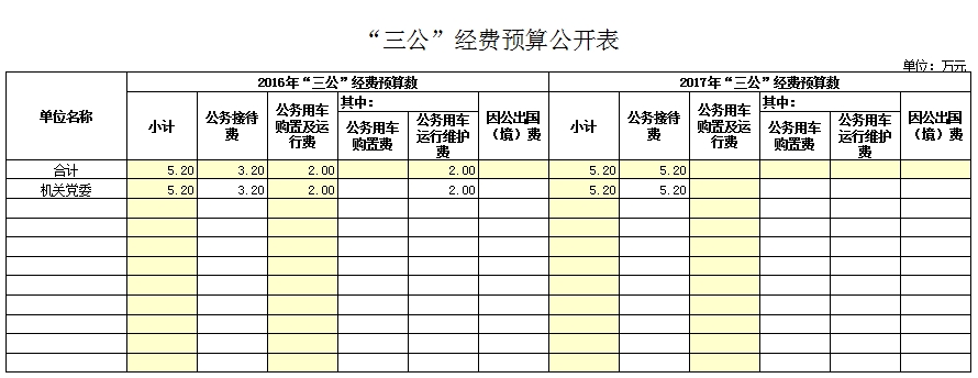 2017年“三公”经费预算数为 5.2 万元,其中,公务接待费 5.2 万元,2017年“三公”经费预算与2016年持平。