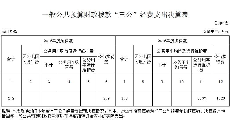 2016年“三公”经费支出合计1.3万元,比公开的部门预算数减少了1.6万元,公务接待费主要是文物保护和文物发掘工作用餐。没有因公出国(境)费用。